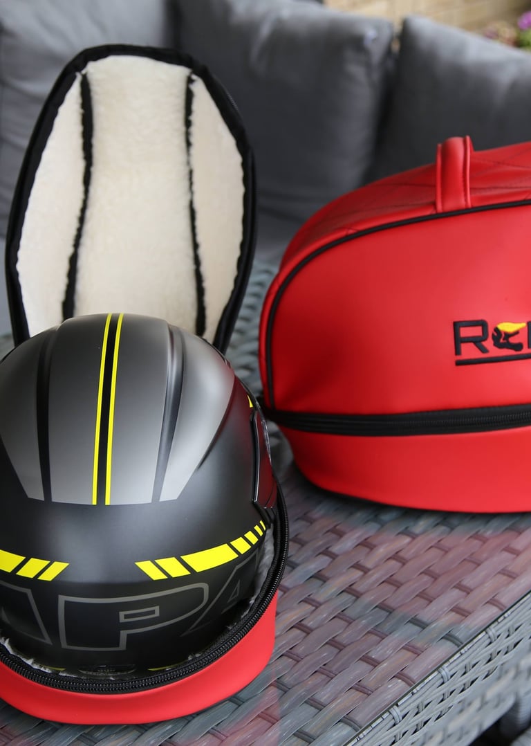 Explore our exquisite helmet bag and waterproof rain cover, designed for those who demand quality and style in their motorsport accessories.